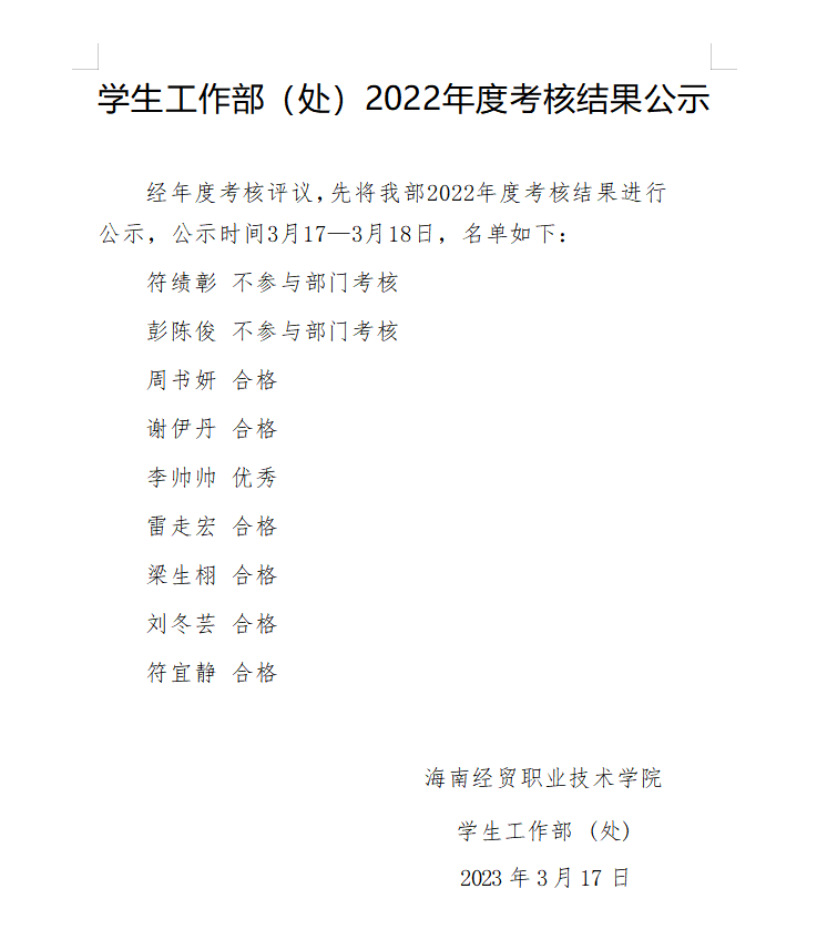 学生工作部(处)2022年度考核结果公示