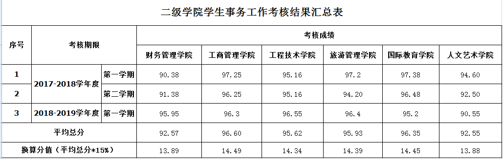 根据beat365二级学院学生事务工作考核实施细则,经过学生事务工作检查评估组成员打分,现将2017-2018年度第一学期、2017-2018年度第二学期和2018-2019年度第一学期,共三个学期学生事务工作考核结果如下: