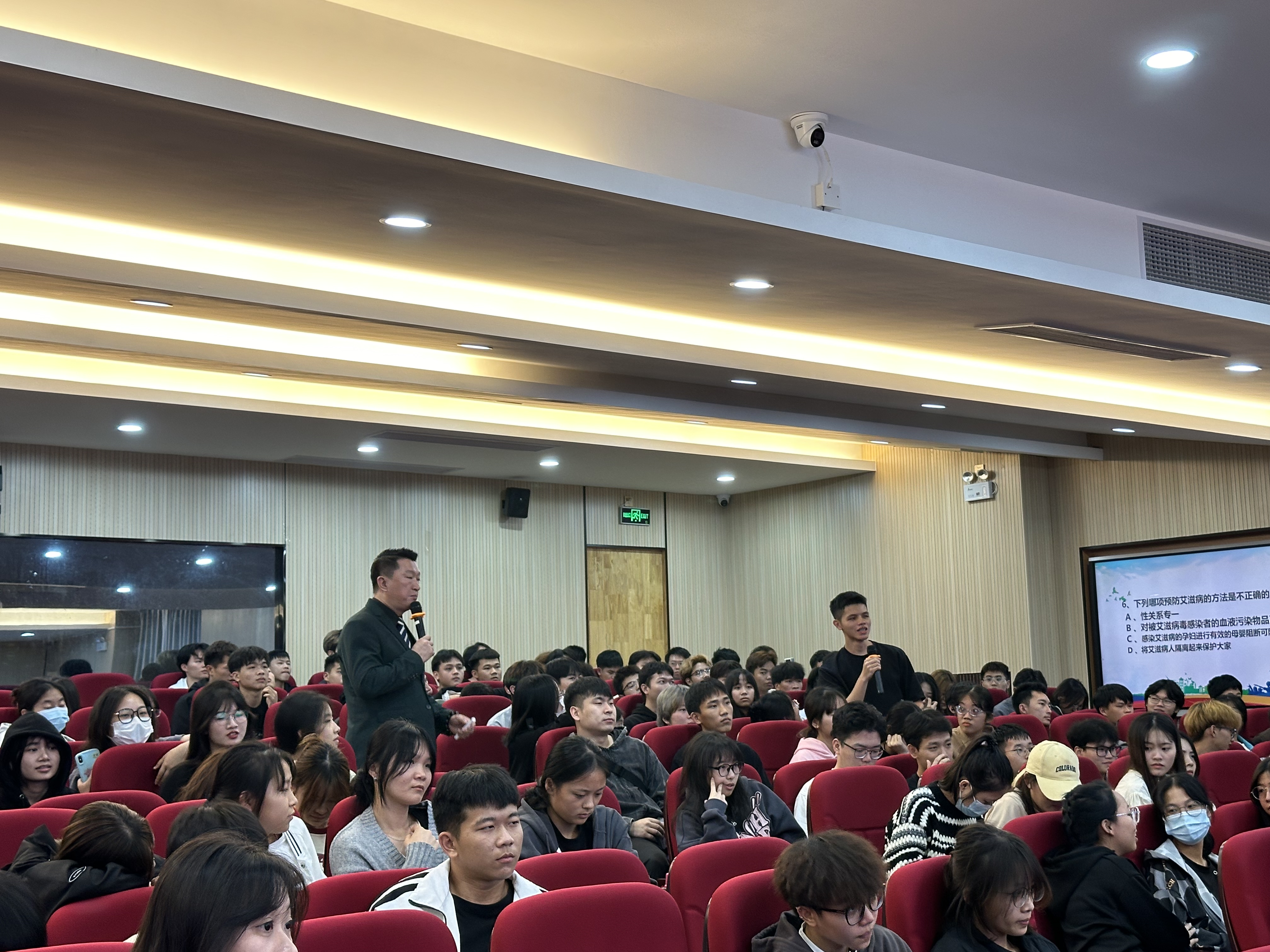 海口市高校艾滋病防治宣讲团的老师们首先结合演员表演的十种个人行为,为师生们分析了哪些行为是主张的、哪些行为是需要警示的、哪些行为是需要拒绝的,引导师生筑牢防艾的第一道防线。通过表演和讲座结合的形式,热情耐心地向我院学生讲解艾滋病的基本知识、传播途径、预防措施、对个人和社会的影响、艾滋病防治策略等,用形象的语言,生动的案例,声情并茂的阐述预防艾滋病的重要性和紧迫性,提醒我院学生在日常生活中要提高防艾意识,积极学习和了解艾滋病防治相关知识。