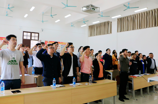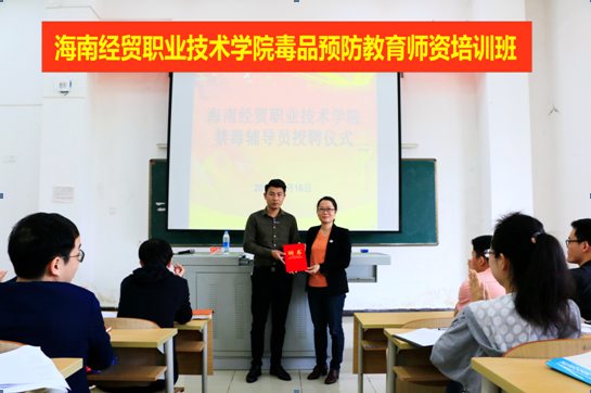 本次培训邀请了海南省高校禁毒联盟主席、省高校禁毒教育宣讲团团长汪腾老师。在培训会上,首先由学生工作处处长黄邦姬给王老师颁发聘书,聘汪腾老师为“beat365校外禁毒辅导员”。随后,汪老师带领全体学工人员进行禁毒宣誓仪式。