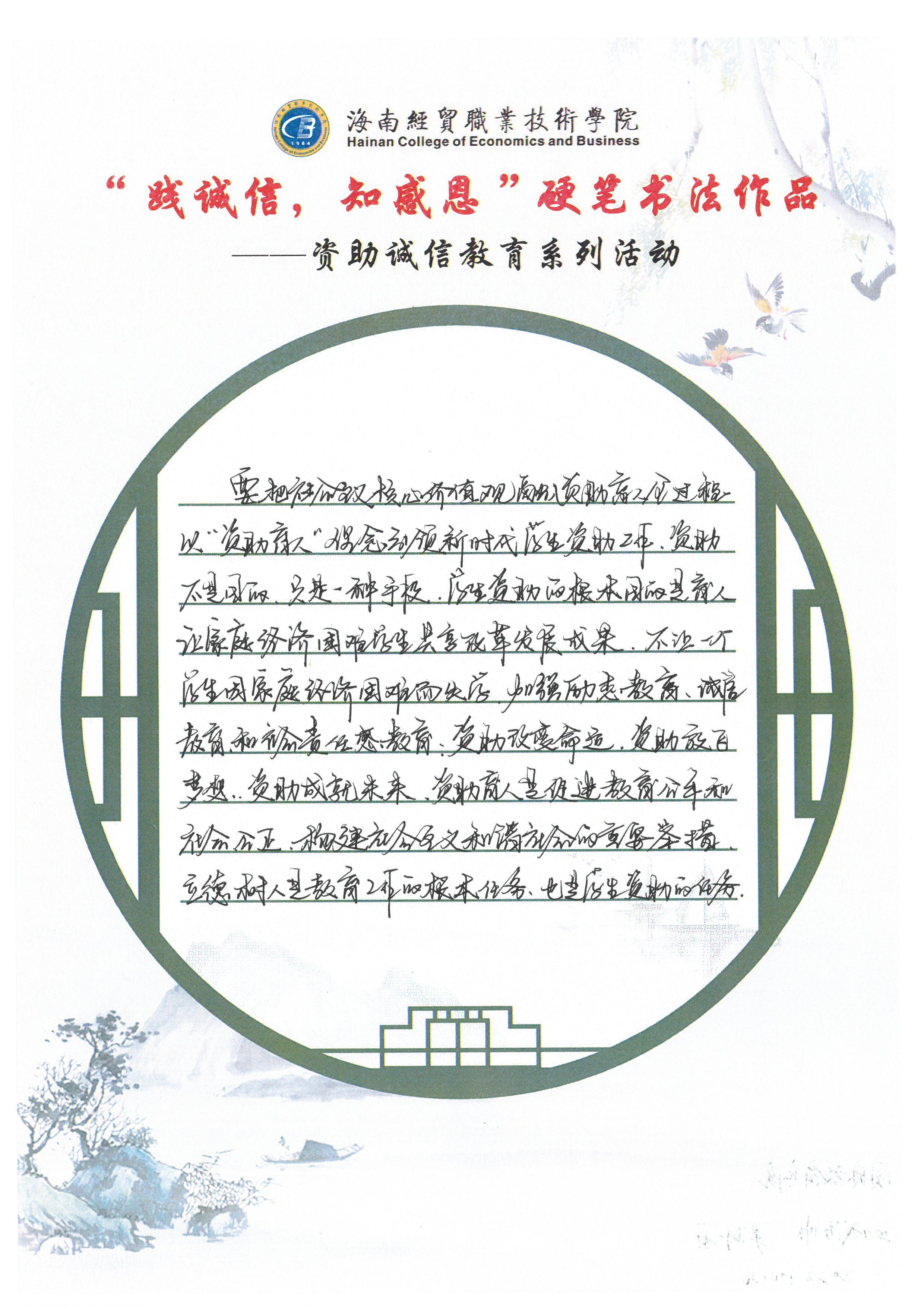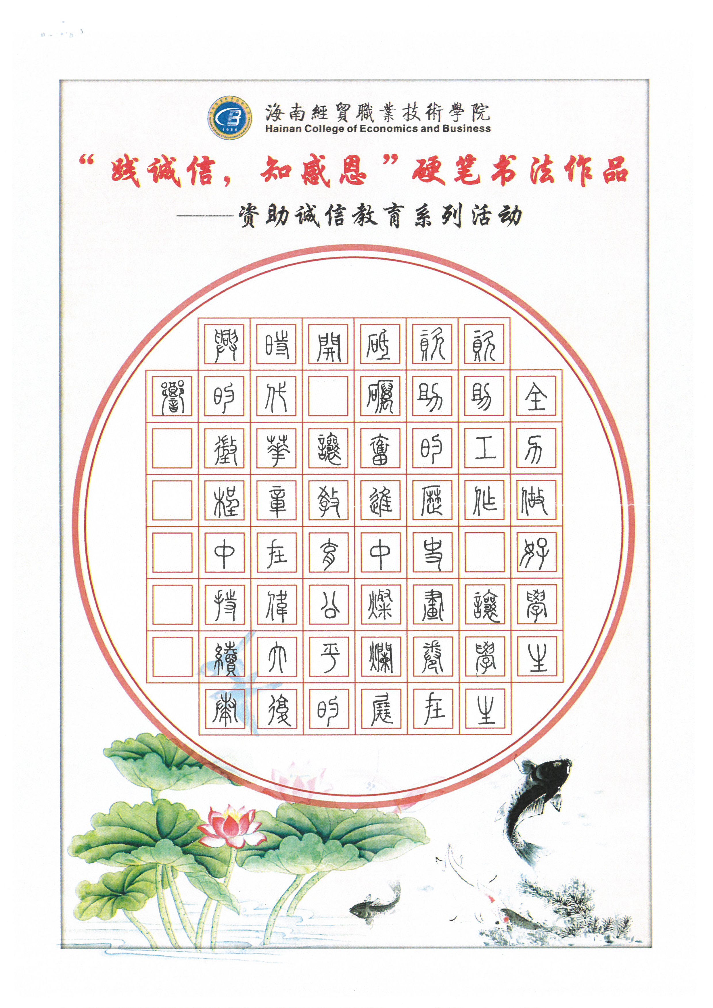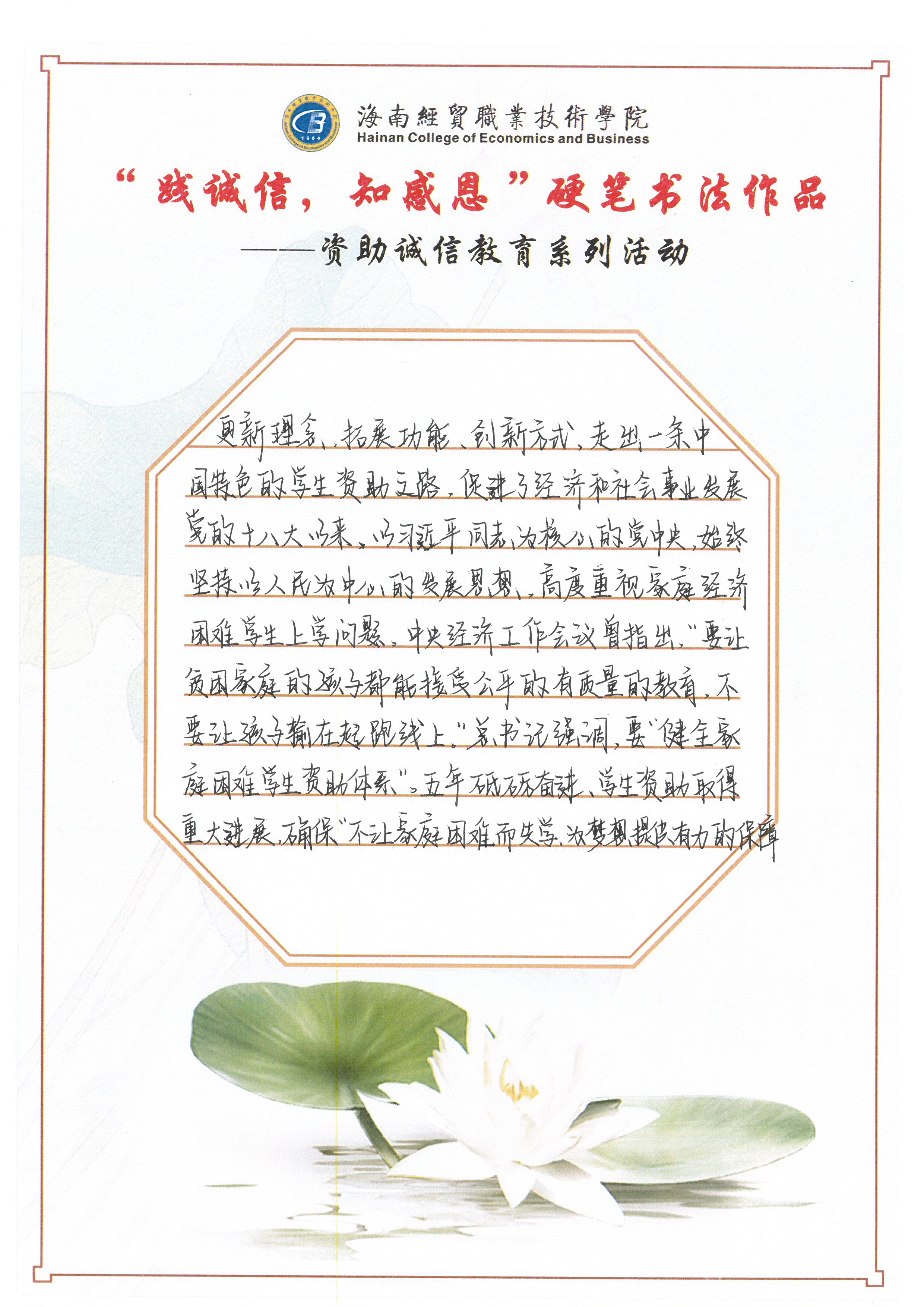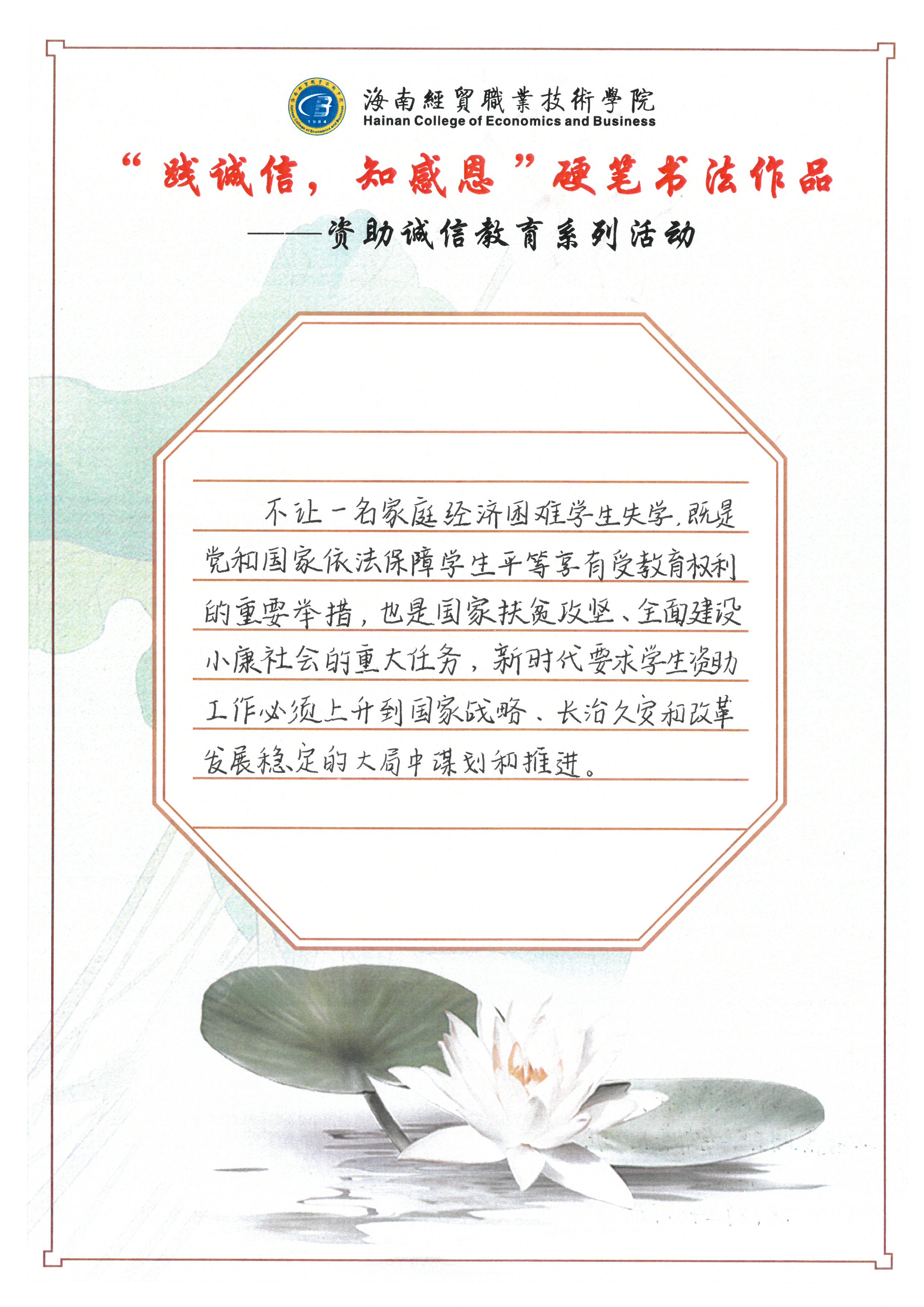 为深入学习贯彻习近平新时代中国特色社会主义思想和党的十九大和十九届历次全会精神,全面贯彻党的教育方针,不断加强精准资助,大力推进资助育人,激励广大受助学生奋发自强、励志成才、感恩回馈。我校特此开展了“践诚信,知感恩”学生硬笔书法作品征集评选活动。