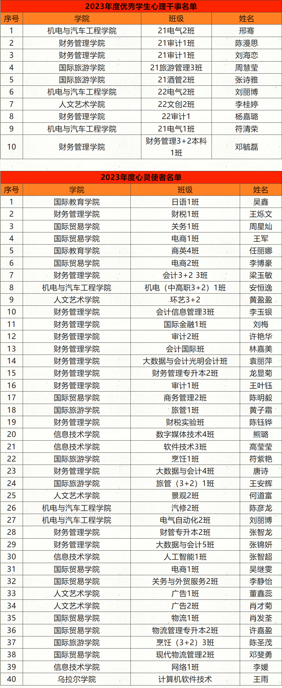 为充分发挥学院学生心理骨干在朋辈心理辅导、维护校园安全稳定中的重要作用,加强对学生心理骨干的管理及指导,调动学生心理骨干的积极性,根据学生工作部(处)学生心理骨干评选要求和评选办法,评选出2022至2023年度优秀学生心理干事、心灵使者共50人。