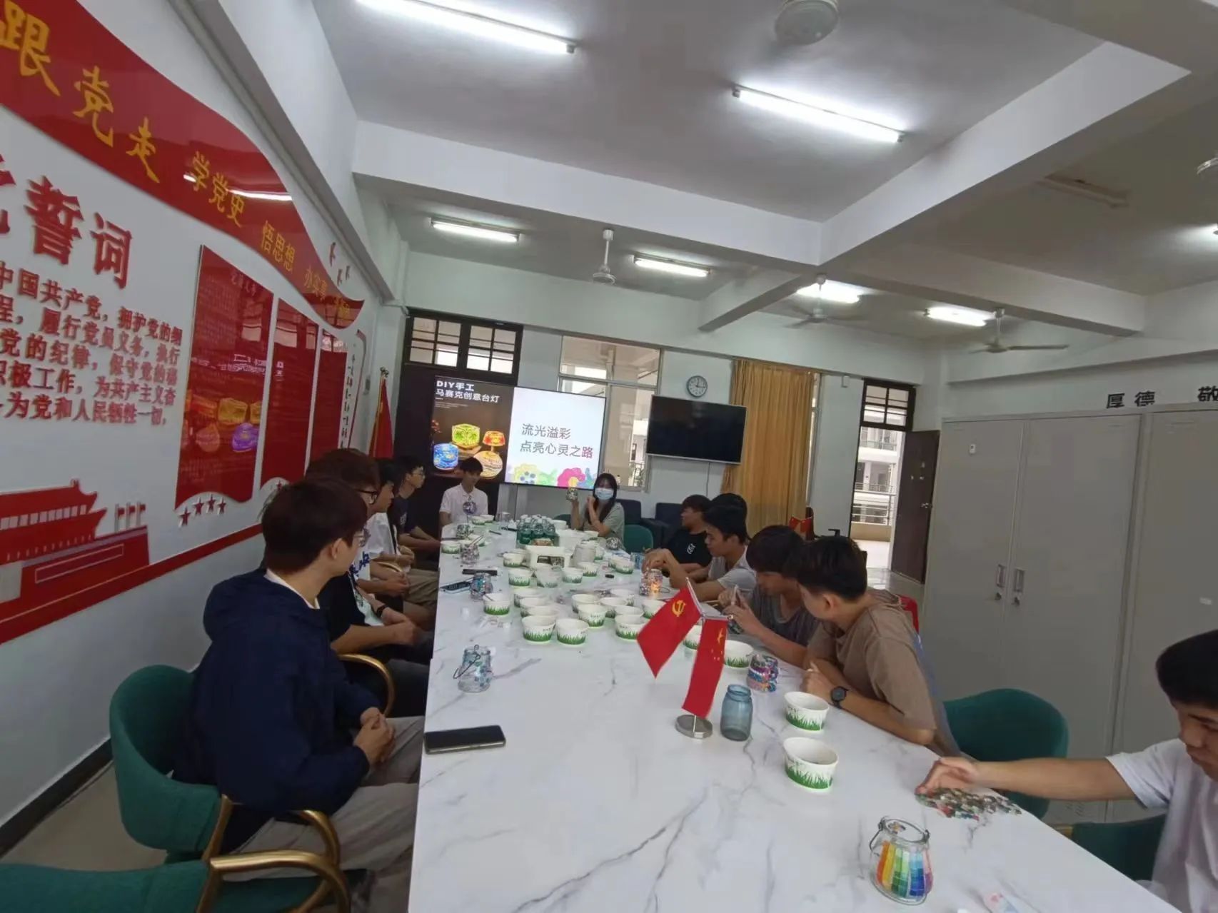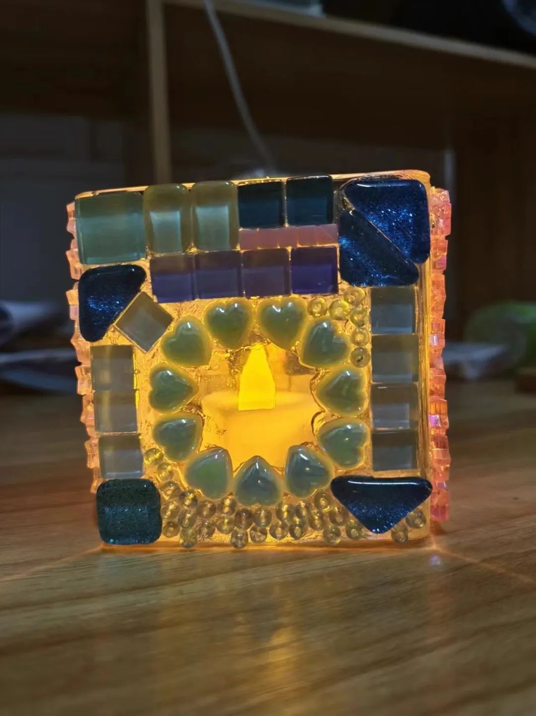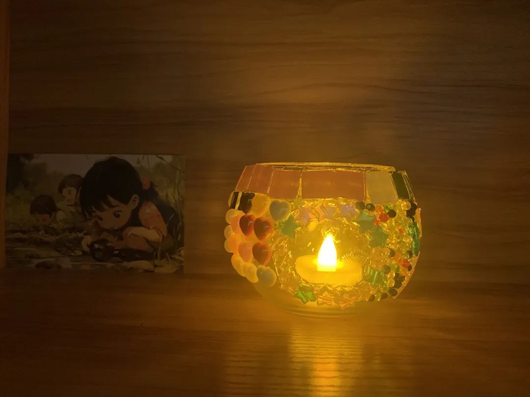 接着就轮到动手制作的环节啦!大家拿着制作材料,兴致勃勃地潜心装扮,点亮心里最美的那束光,时不时和同伴互相品评交流,笑语盈盈,领略不同的马赛克贴片带来的不同光影变化惊喜。