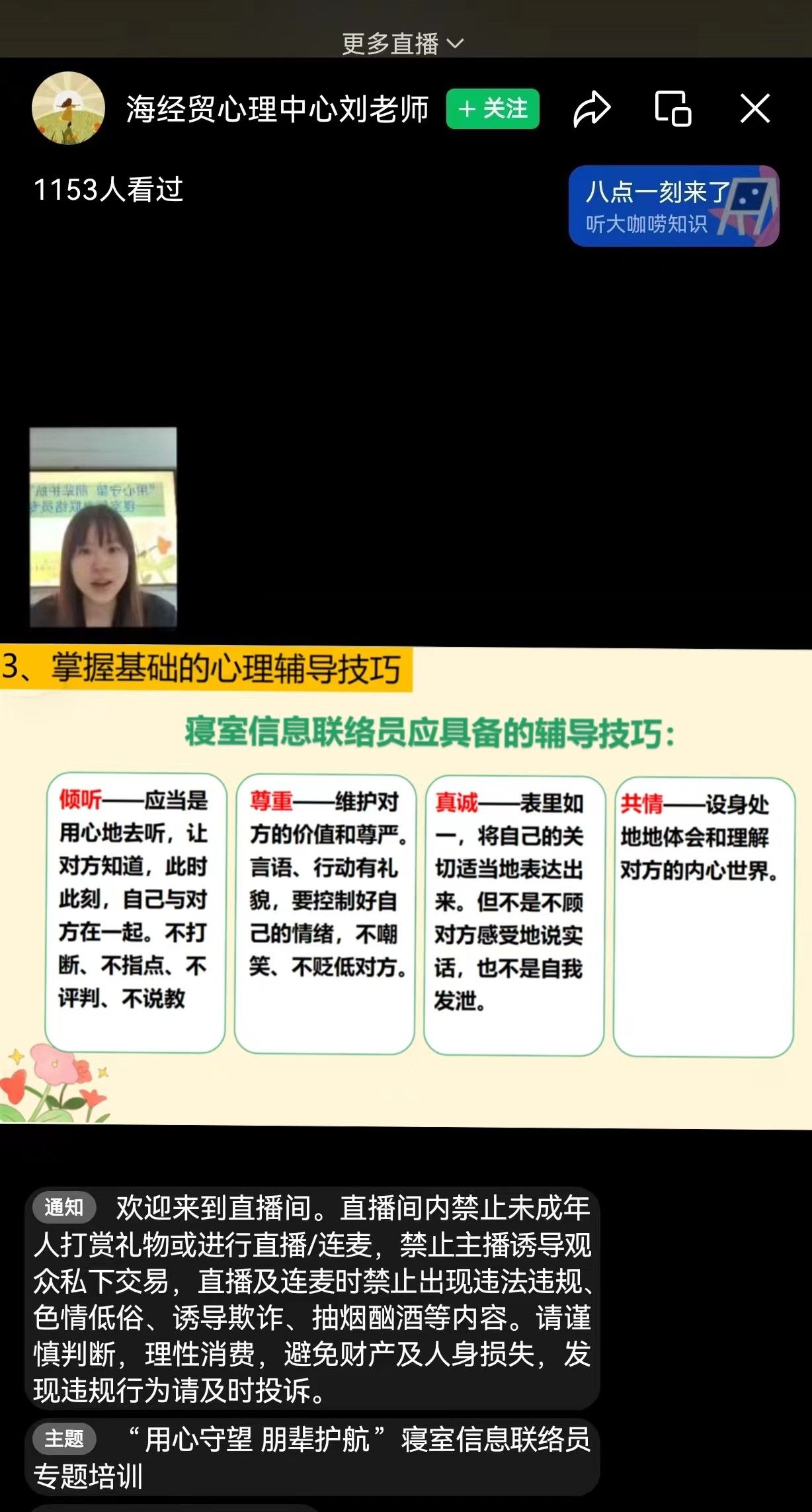 刘老师从寝室信息联络员的角色定位和工作职责、发现与识别常见心理问题、掌握基础的心理辅导技巧等方面普及了相关心理健康知识。强调了寝室信息联络员是构建大学生健康心理育人环节不可或缺的一员,要充分发挥朋辈心理辅导的正向引导作用。