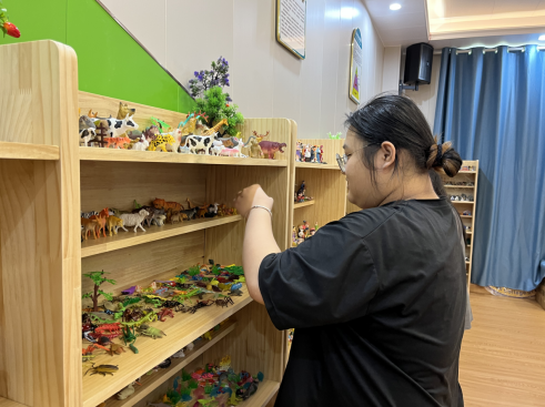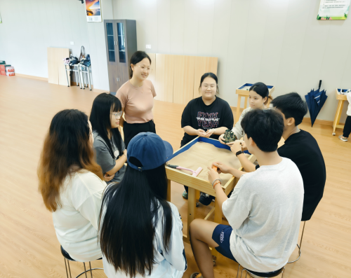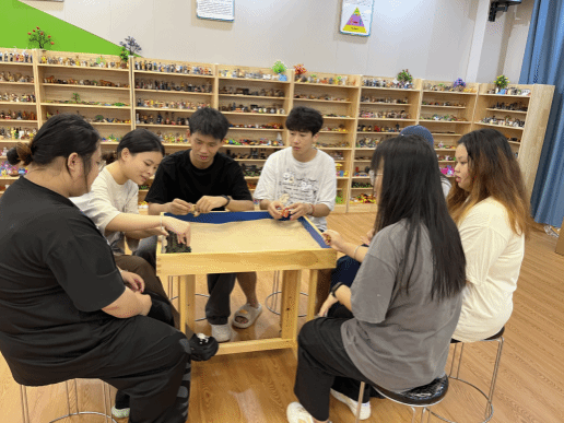 活动开始前,周书妍老师带领同学们通过抚摸沙子,感受沙子的形状、温度,与手指接触的感觉,聚焦感受,放松心情;寻找一个沙具代表此时的感受并进行组内分享;观察沙具,介绍心理沙盘的起源、操作规则及注意事项,让同学们以最舒适、最放松的状态投入到沙盘体验中。