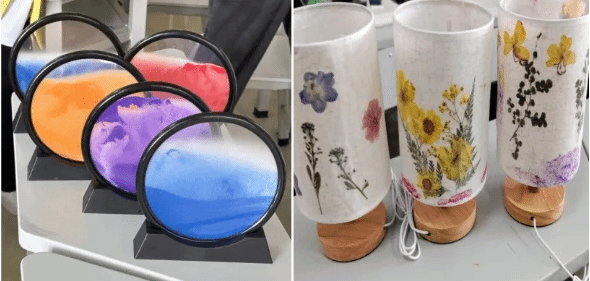 另一部分同学则专注于手工灯的制作,他们挑选自己喜爱的灯罩与干花,通过巧妙的构思与精细的组装,制作出一盏盏既实用又美观的干花手工灯。同学们diy的流沙画与手工灯作品精彩纷呈,心灵艺术绽放光彩。