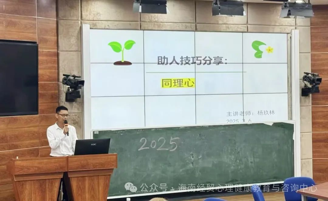 杨玖林老师为心理骨干队伍作了题为《助人技巧分享:同理心》专题一培训。他巧妙运用生活中同学熟悉的语言和案例进行了导入,发起“朋友失恋了你怎么安慰呢?”引发参会同学的思考。通过列举生活中常见的几种缺乏同理心的表现如:鸡汤型、说教型、比惨型来指出同学们在日常助人中常见的误区。通过视频动画展示,讲解了同情心和同理心之间的区别,并进一步解释了非同理心表达中建议、解释、探问三种做法所起的负面作用。通过培训,参会心理骨干经过对照学习、互动参与,逐步认识到同理心在日常助人工作中的重要性。