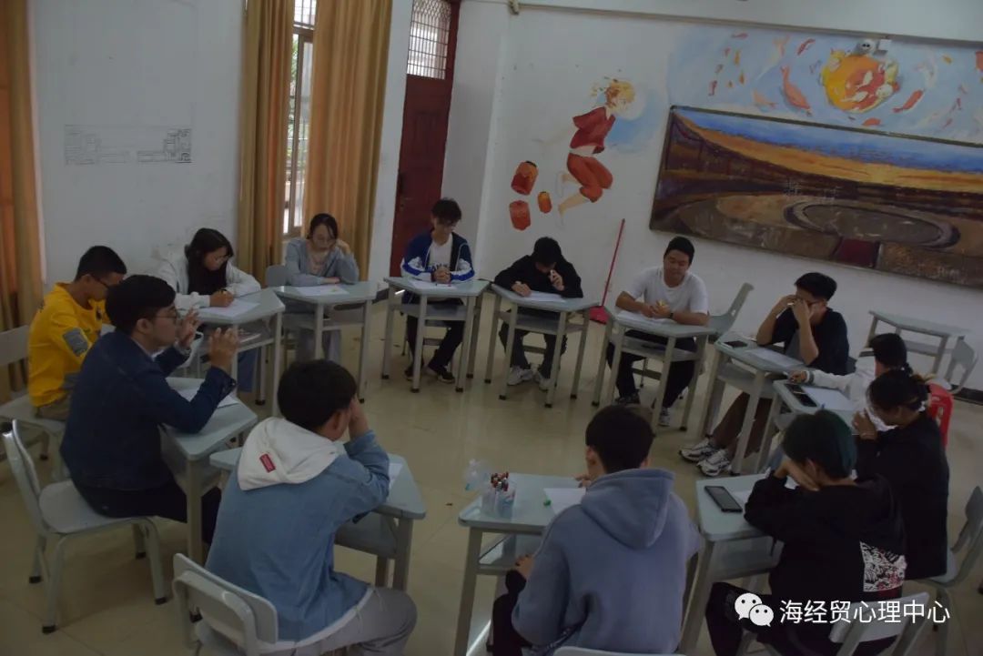 活动开始时,陈老师首先和同学们进行简短的团体介绍与团体公约说明。接着通过“握手对对碰”热身活动,让同学们互相认识、全身放松、拉近关系,并且以相对舒适的身心状态投入下一阶段的活动。