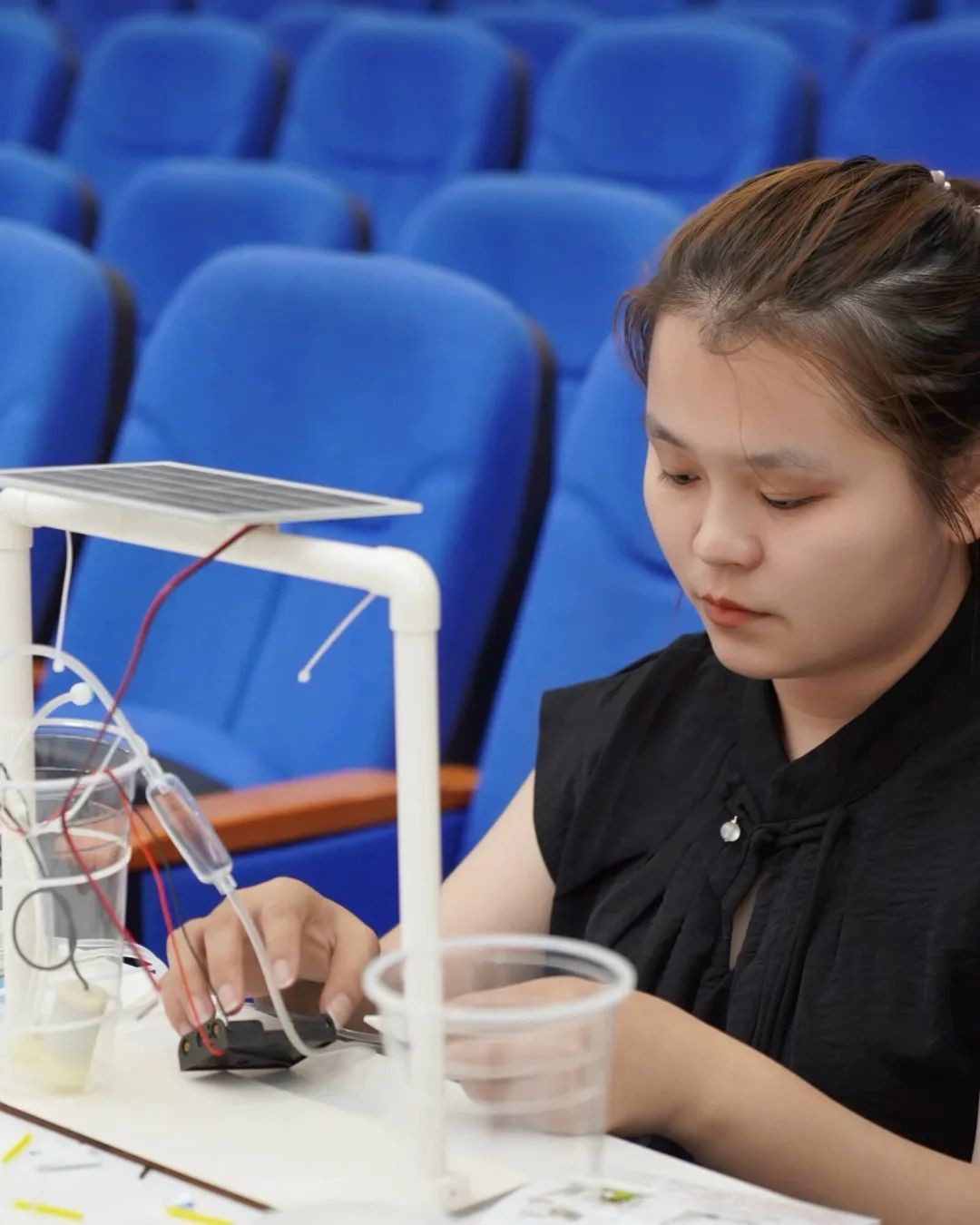 活动中,符传栋老师亲自上阵,以其娴熟的技巧率先完成了太阳能浇花模型的组装,为参与者树立了良好的榜样。活动巧妙融入了团体心理辅导元素,以手工制作为载体,让参与者在动手实践中探索心灵世界。大家热情参与,有的精心连接部件,有的细心固定管卡,彼此间交流协作,共同克服困难,如水管连接不稳、电路调试等,展现了非凡的探索精神与创新意识。