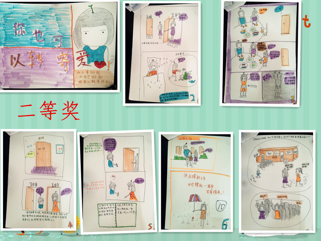 本次大赛最终评选出9幅作品,分别是一等奖2名,二等奖3名,三等奖4名。财务管理学院14级会计3+2班杨巧帆荣获一等奖,国际教育学院14级商务英语一班候翠莲荣获一等奖;国际教育学院14级商务英语一班陈宣兆荣获二等奖,工程技术学院14级德诺浩二班梁生和荣获二等奖。